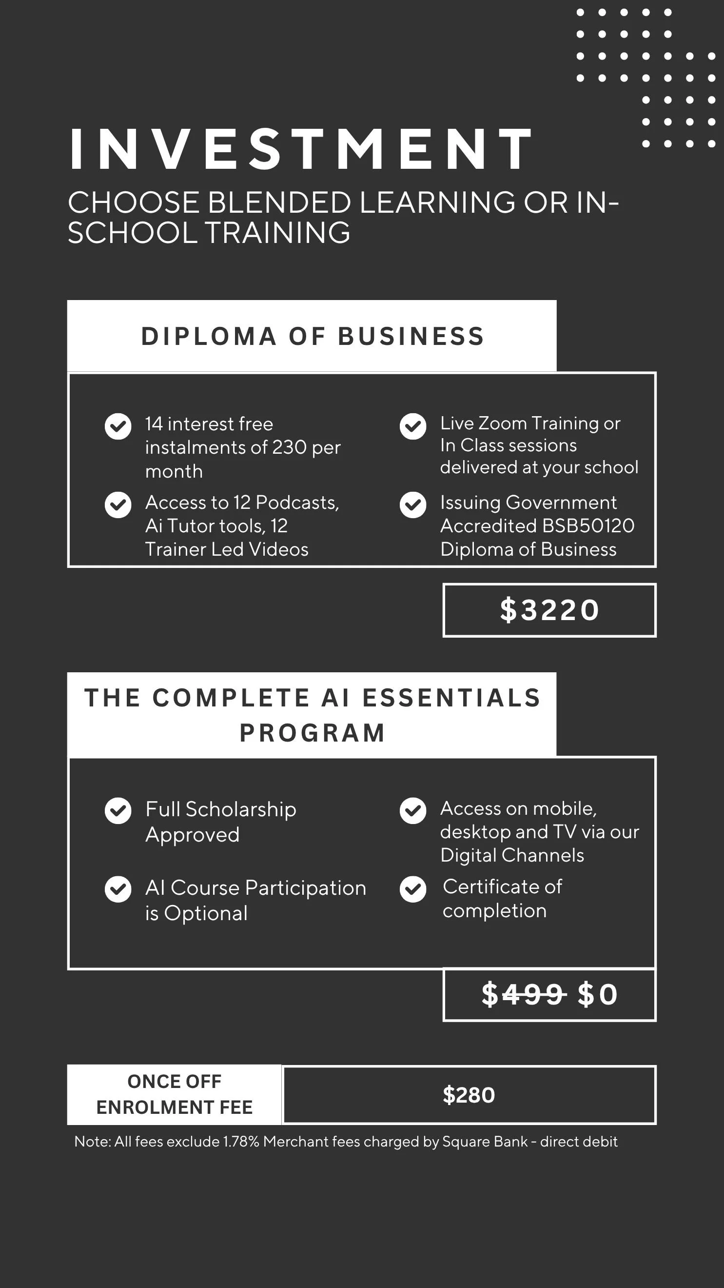 Once your LLND results are processed (usually within 24 hours) and all other eligibility steps have been confirmed, we’ll send you the formal enrolment form, training contract, and direct debit agreement. Payments are securely processed via Square or bank transfer — we do not collect or store credit card information.