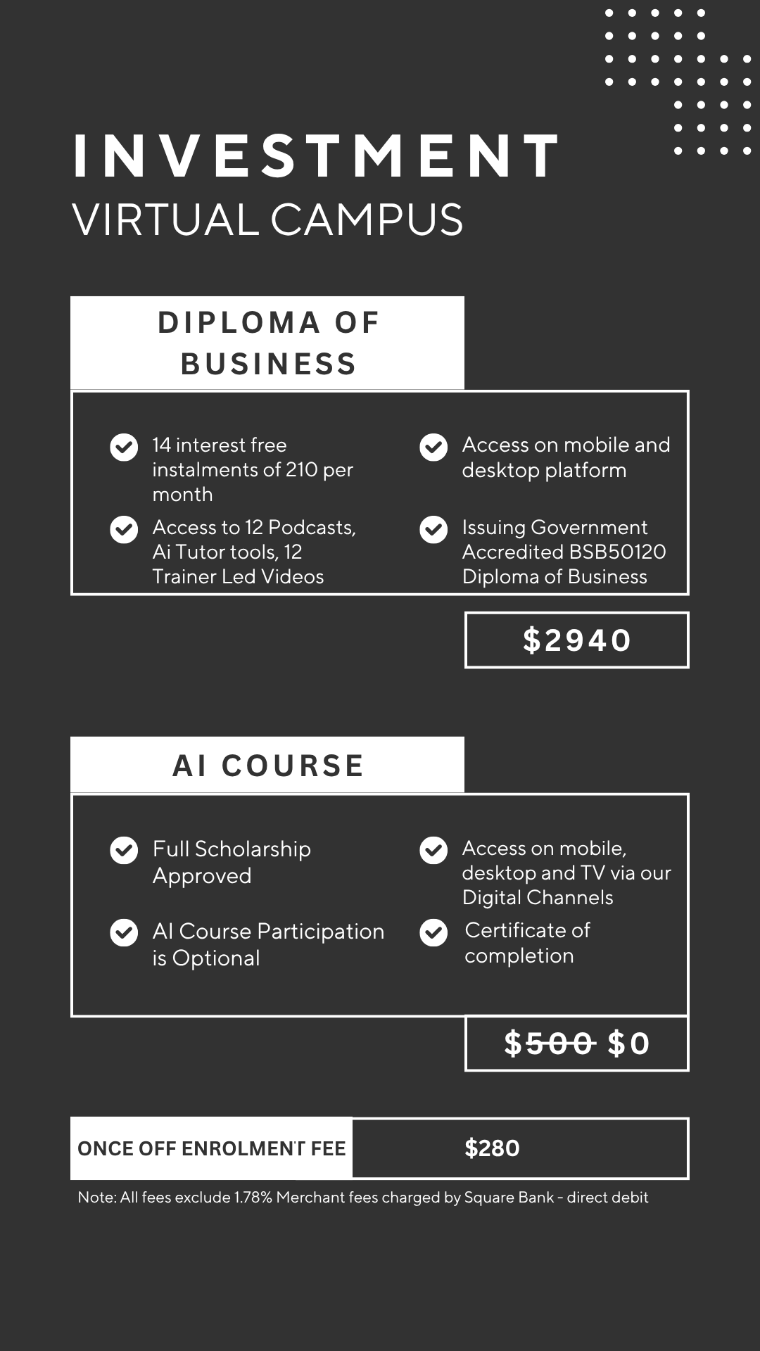 Note: A small 1.78% bank processing fee may apply depending on your payment method.What does the $280 pre-enrolment fee include?